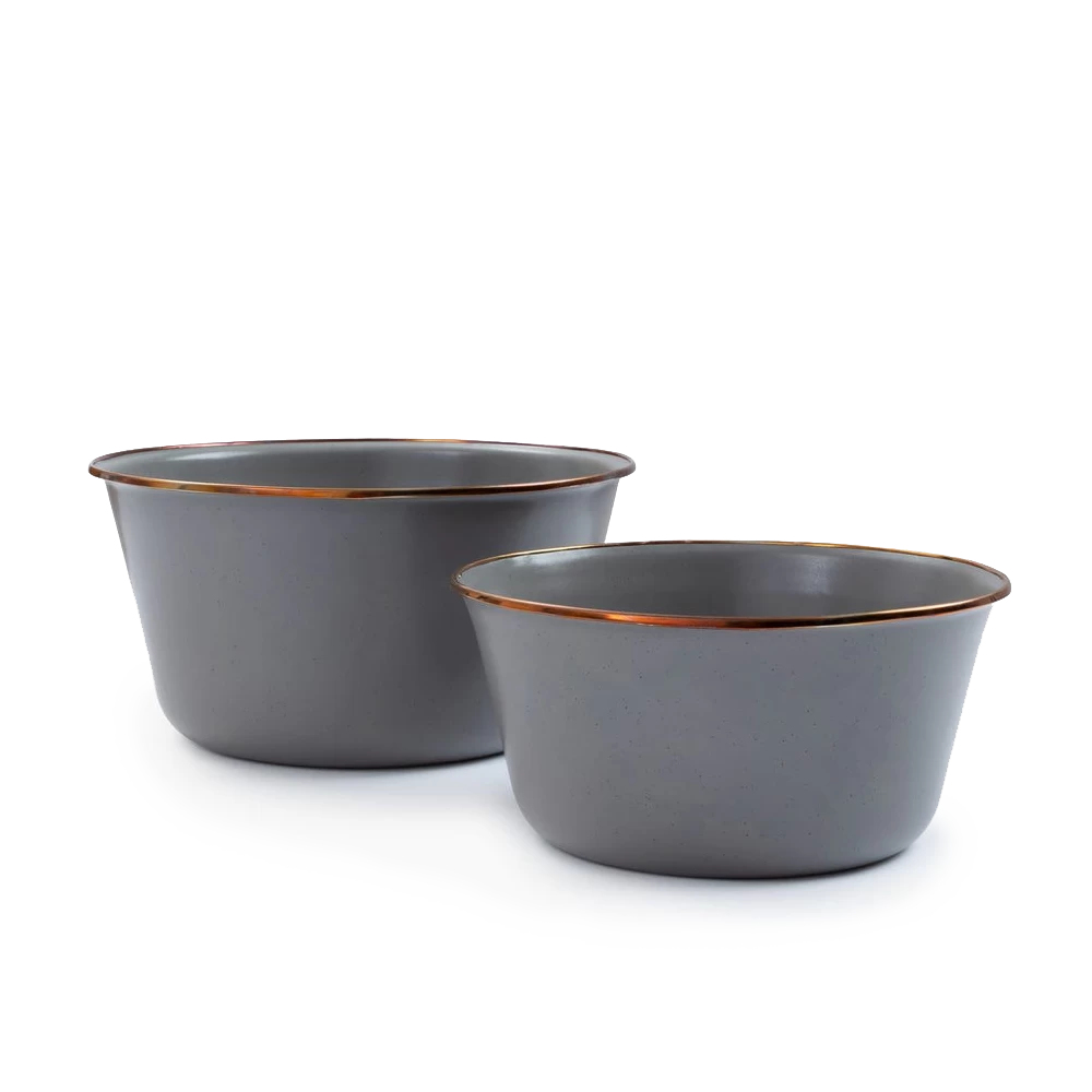 Process wet and dry ingredients to make all of your favorite sweets, breads, pastries, and more. Durable and sophisticated enough for both your camp kit and kitchen cooking, this Mixing Bowl Set features a hand-finished, baked stainless steel trim that creates a bronze-like patina finish. Lightweight and stackable.