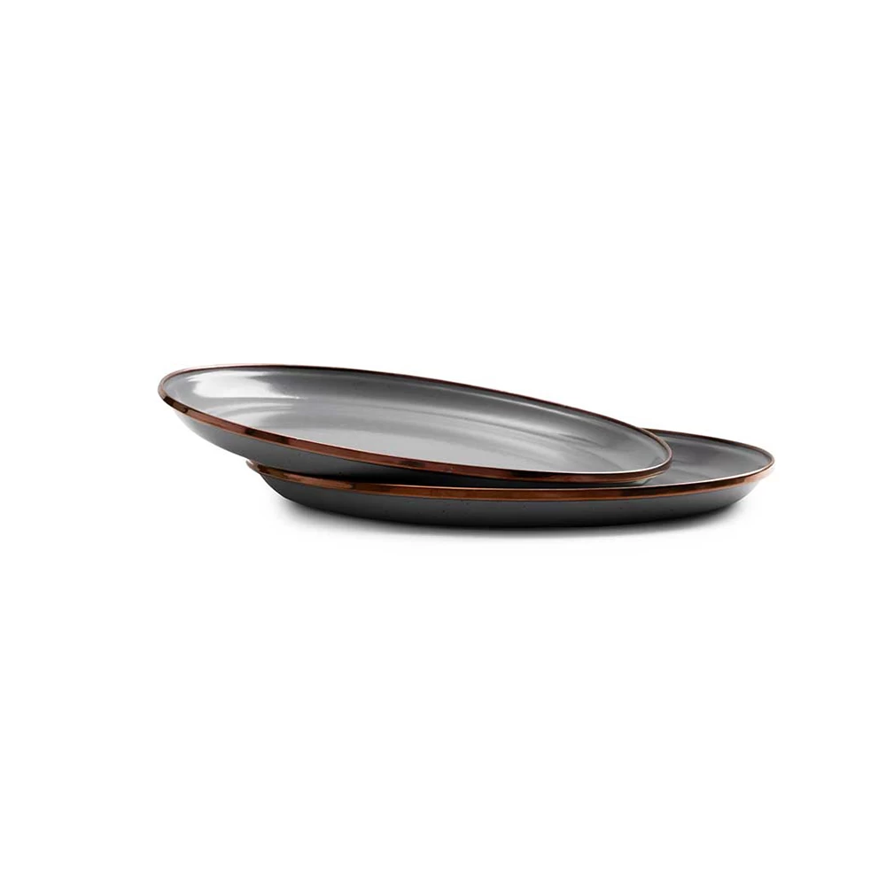 The curved edges of the Enamel Deep Plates are both design-forward and useful, keeping rich sauces and sweet compotes in the dish and off your table. Each item features a hand-finished baked stainless steel trim creating a copper-like patina finish, resulting in unique pieces that form a cohesive set.
