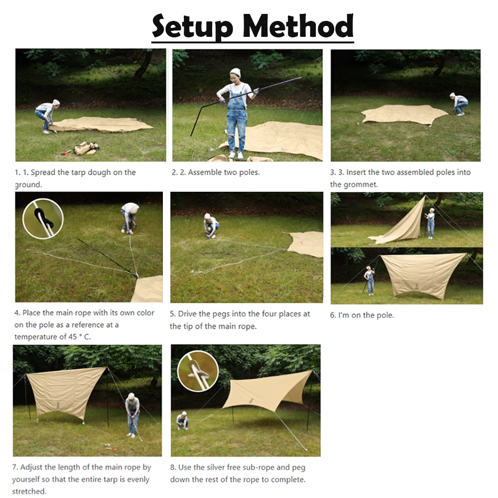 - Accessories included: Peg x 8, rope x 8 (black free x 4, silver free x 4), pole x 2, extension belt, carry bag