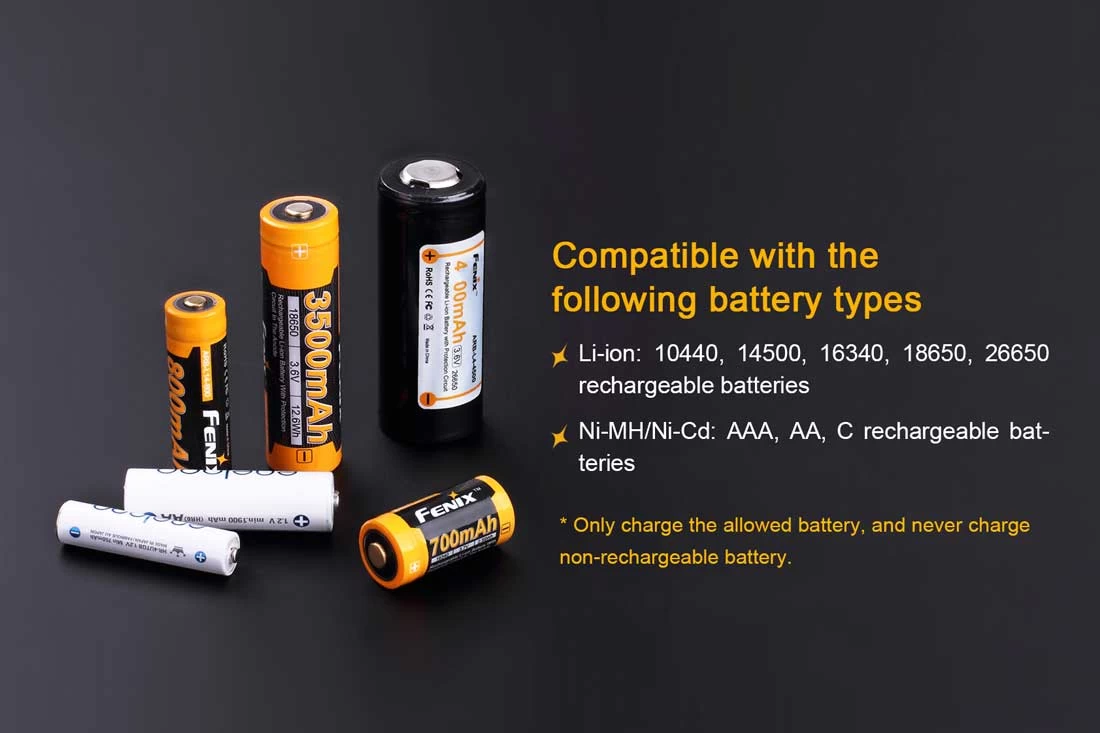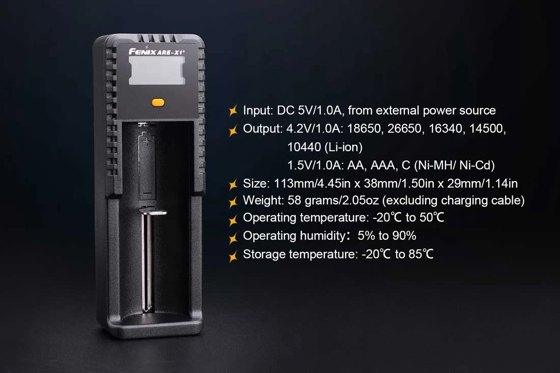 The Fenix ARE-X1+ is single-channel smart charger, built for different types, and different size, rechargeable batteries. The charger will automatically choose the correct charging mode for each battery type, whether it be Li-ion, Ni-MH or Ni-Cd. The high-definition LCD screen displays charging status and battery levels. Built-in multi-protection guarantees charging safety.