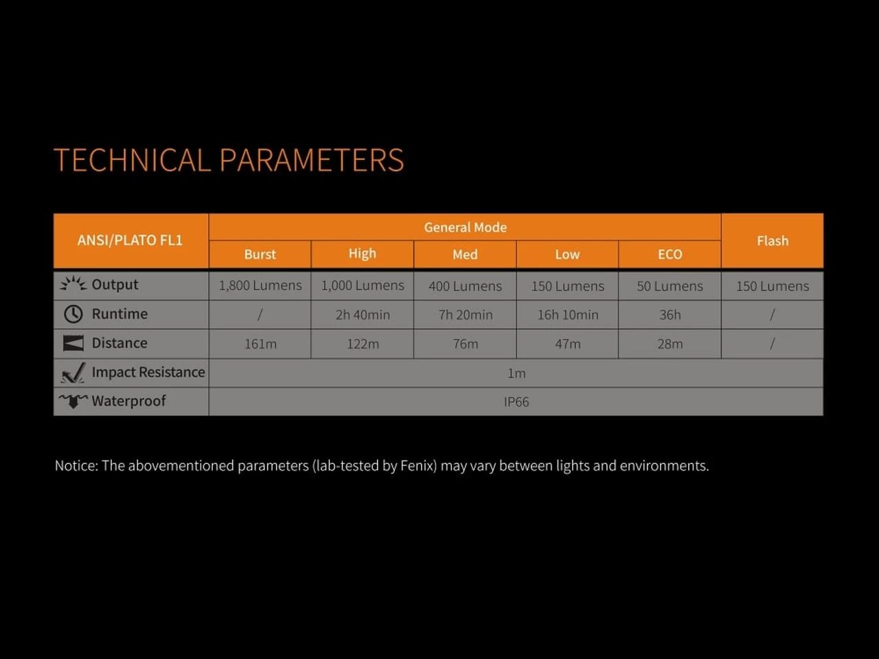- Burst 1800 lumens (528.2 feet/161 meters)