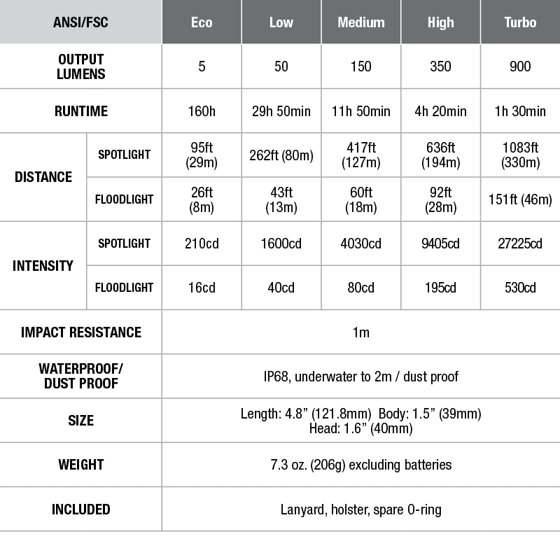 The Fenix FD45 Focus Flashlight features a focusable beam which, by a simple twist of the head, allows you to go from a 94° floodlight (for greater close-in visibility) to a tighter 7° spotlight (for far distance viewing). Fitted with a neutral white LED, the Fenix FD45 has a maximum output of 900 lumens and a maximum beam distance of 1,083 feet. Powered by readily available 4 AA batteries, this flashlight has five brightness levels plus Strobe and SOS. This compact tool is waterproof/dustproof and is great for general use and outdoor activities, where versatility of light and convenience of AA batteries are in great need.