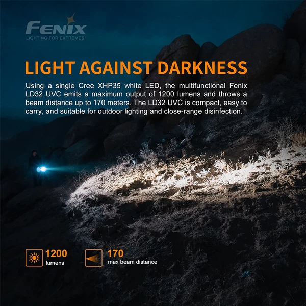 The Fenix LD32 UVC is a portable outdoor flashlight with UVC disinfection function. Powered by a single 18650 Li-ion battery, the multifunctional Fenix LD32 UVC emits a maximum output of 1200 lumens and throws a beam distance up to 170 meters. The round switch in the neck is for instant output selection. Simultaneously press the UV switches on both sides of the neck to activate the UVC light, which has a multitude of uses, most importantly in disinfection function. High-power ultraviolet UVC light can disinfect most common bacteria and viruses in just tens of seconds. The LD32 UVC is small in size, easy to carry, and suitable for outdoor lighting and close-range disinfection.