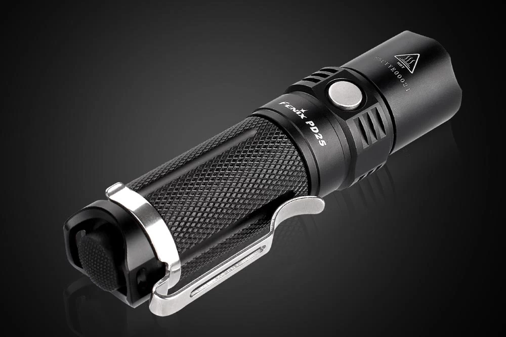 The Fenix PD25 is a powerful, tiny flashlight featuring the latest Cree XP-L LED. This flashlight produces max 550-lumen and 427ft beam distance from a 16340 rechargeable Li-ion battery. The tail cap switch provides momentary-on function while the side switch on the head is for output selection. The Fenix PD25 flashlight is perfect for the outdoors or your every day needs.