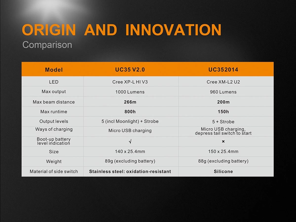 The Fenix UC35 V2.0 rechargeable flashlight is the 2018 upgrade to the Fenix UC35 flashlight. Fitted with the Cree XP-L HI V3 LED, this light delivers a maximum 1000 lumens at a distance of 873 feet (266 meters). Turn the light on and off with the tactical tail switch and cycle through the six lighting modes via the newly designed metal side switch—which also has a built-in battery level indicator. You can achieve an incredible 800 hours of runtime when using the new moonlight brightness level. Compact and built-tough, the UC35 V2.0 flashlight is IP68 rated; dust proof and waterproof underwater to two meters.