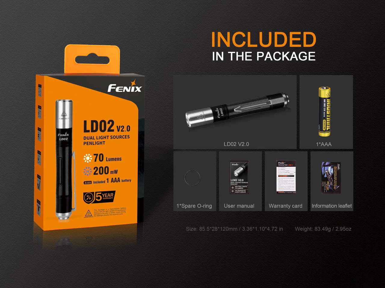 The Fenix LD02 V2.0 is an exclusive everyday carry Pen light with 70 Lumens of warm white light and 200mW of UV light. The Upgraded model features many new options that make this new pen light an amazing EDC. First, let talk about the size. The Fenix LD02 V2.0 is super compact weighing in at only 24 grams or 0.84 ounces. The length is only 3.6 inches and 0.5 inches in diameter making it easy to carry in your pocket, never bulky. The New Fenix LD02 V2.0 is powered by one single AAA battery that will last up to 75 hours on the 1 Lumen output mode. The activation is simple, one single click using the anti-corrosion stainless steel tail switch will turn the light on and tapping the same switch will allow you to increase the different outputs. The Cree XQ-E HI LED provides exceptional color rendering protecting night vision and providing good color reproduction. Use the 365nM UV light to inspect objects that contain fluorescent agents or for finding clear anti-counterfeit watermarks. The improved Fenix LD02 V2.0 is IP68 rated making it submersible up to 6.5 feet or 2 meters. Don’t wait, Purchase the newest everyday carry flashlight today!