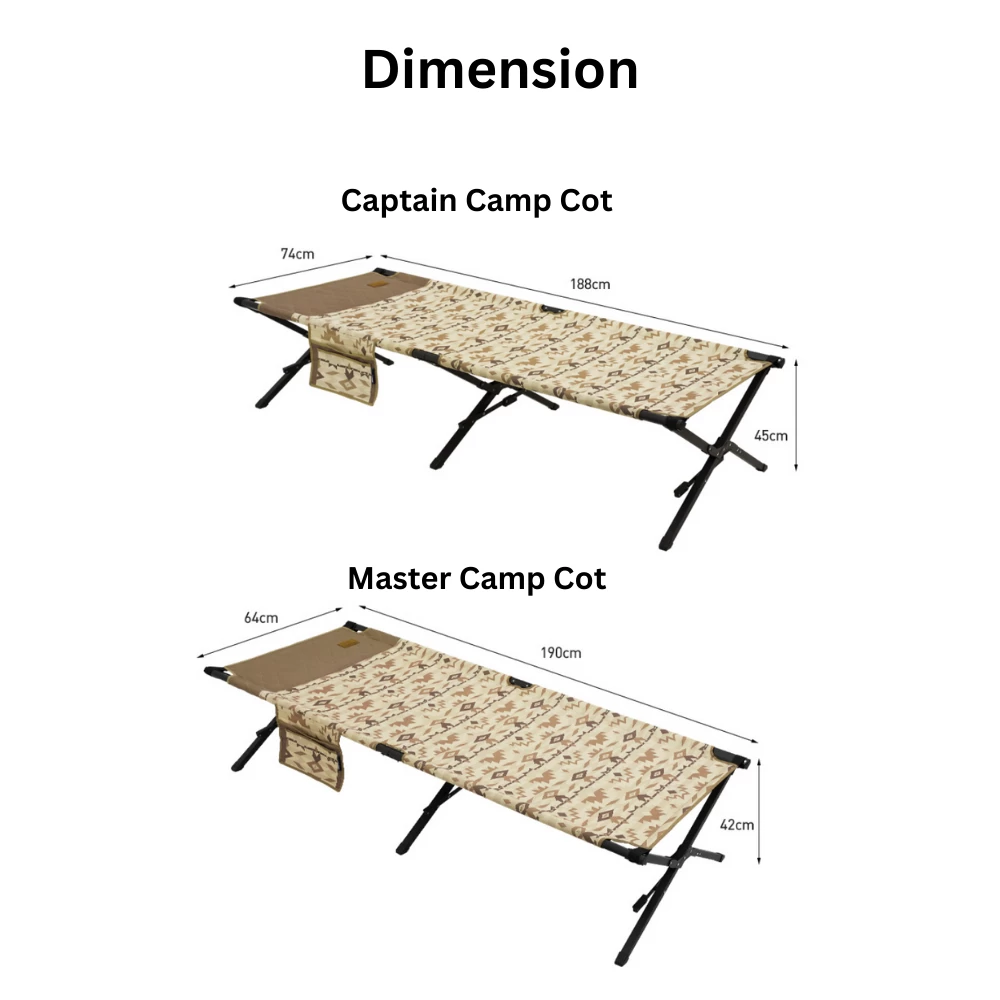 - Captain Camp Cot model has wide size with length 74cm, whereas Master Camp Cot 64cm are comfortably use both for indoors and outdoors activities
