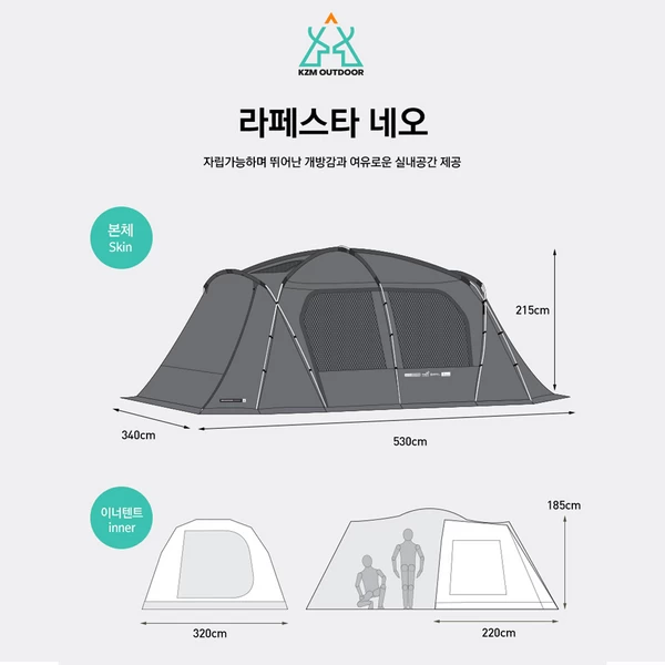 - Size : Upon installation- 530x340x215cm / Storage-80x32x32cm / Inner tent- 320x220x185cm