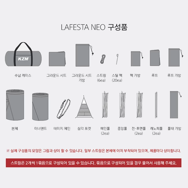 - Component: Main tent, Inner tent, Roof, Ground sheet, Triangular pocket, Daisy chain, Main poleX2ea, Center pole, Front·Back poleX2ea, Canopy poleX2ea,Steel pegX20ea, StringX6ea, Storage Bag
