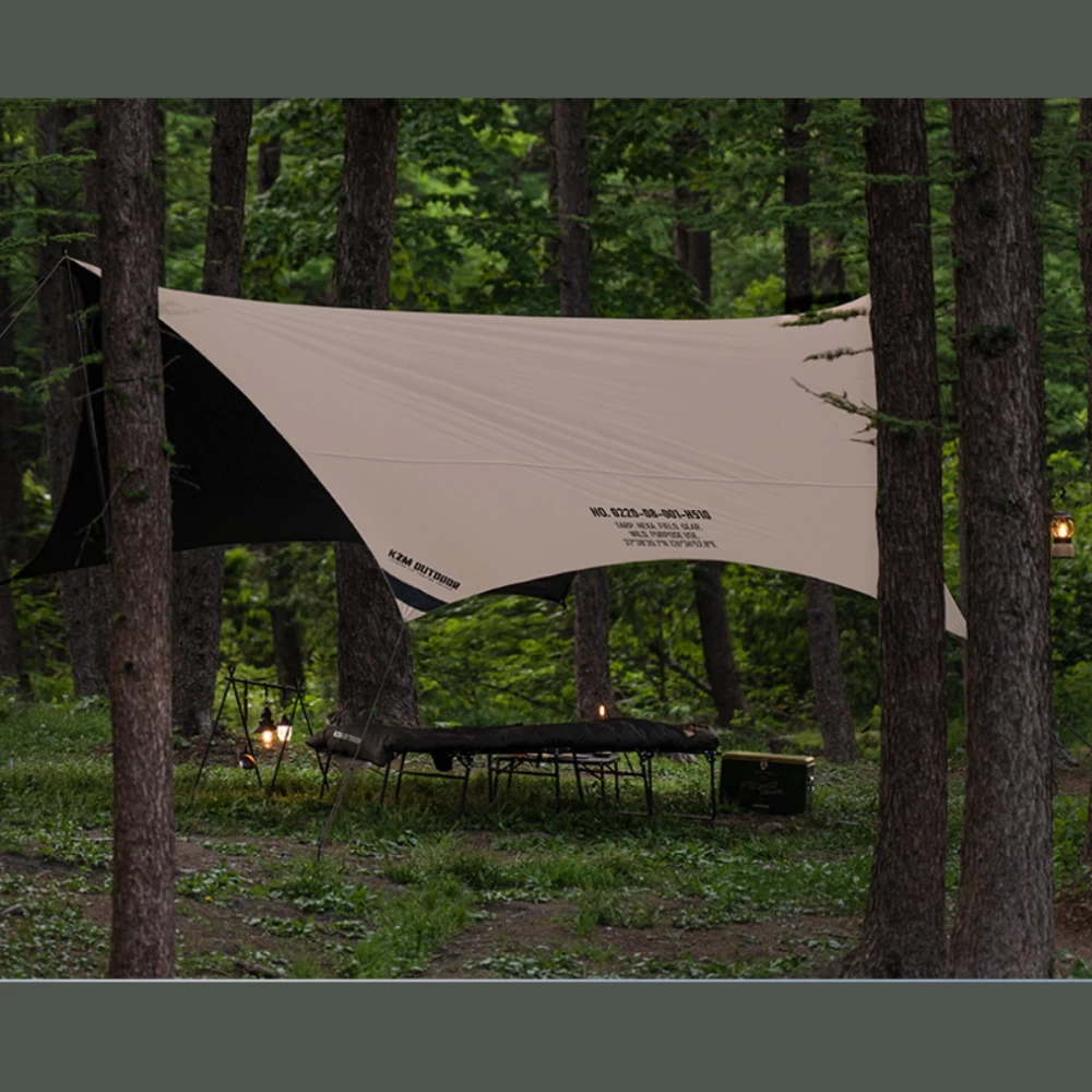 It is a hexa tarp that provides a wide shade at all times with a black pigment coating that boasts excellent light blocking power. It has sufficient waterproof and water repellent power with a water pressure of 5,000 mm. It is made in two colors, khaki and sand.