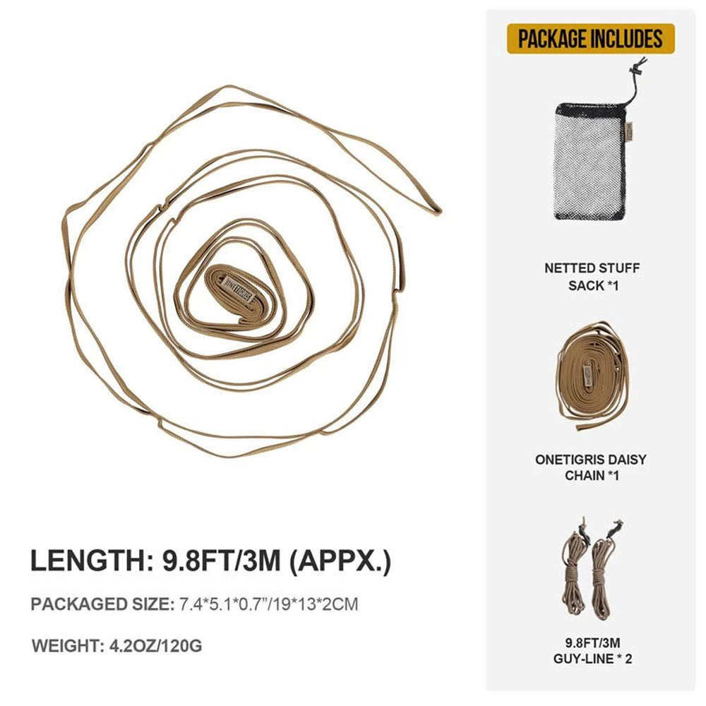 The OneTigris Daisy Chain is approximately 9.8ft long with solidly stitched on loops, 1mm thick and 12mm wide, making it extra sturdy for the rugged outdoors and creative at-home uses. It comes with a durable netted stuff sack and two 3ft/9.8m long light reflective threaded guy-lines, and is the must-have tool to perfect your outdoor setup. Suitable to use at the homes and back yards of experienced gear users.
