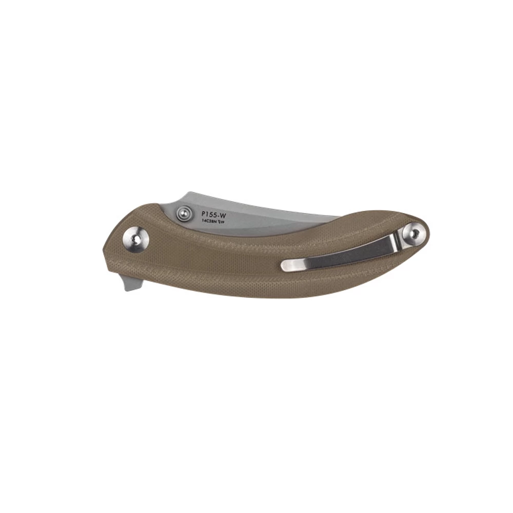 The profile from the blade point to the end of handle is ergonomically curved. The curved handle provides a comfortable grip along with contoured G10 scales, while the trailing-point blade features a long belly of curved cutting edge for multiple cutting tasks. In addition, the safety lock guarantees knife reliability and thus protects users in extensive and various application. A finger choil helps to make the point of the P155 more controllable, which will play a key role in delicate work.