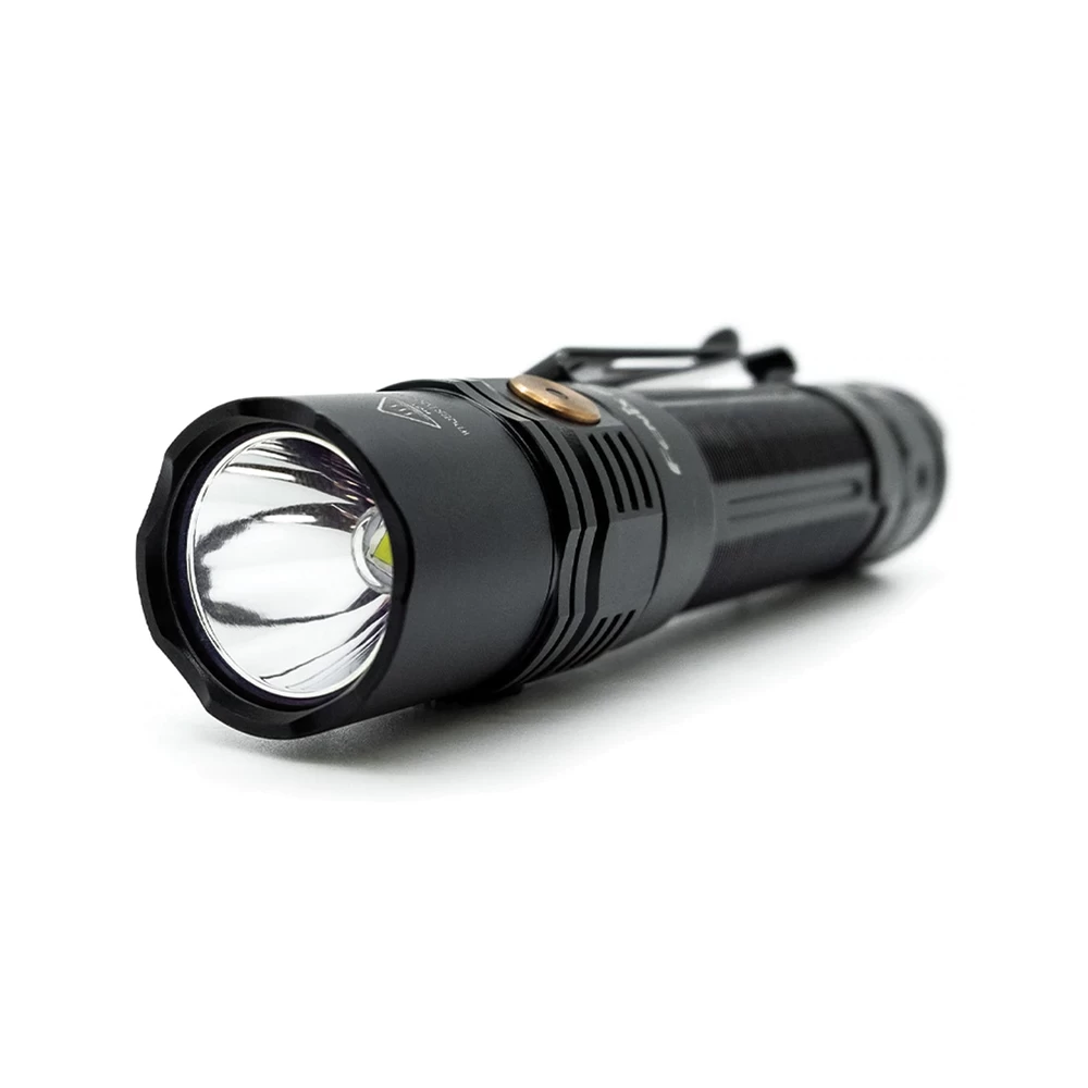 Designed for tactical and professional applications, the Fenix PD36R Tactical Flashlight has an assortment of different features, including a max output of 1600 Lumens on the turbo setting which casts a beam distance of 928 feet. In terms of size, the light is only 5.35 inches in length and 1.04 inches in diameter. Made with a high-strength aluminum, this powerful flashlight can handle the elements and a drops of 1.5 meters on all sides.